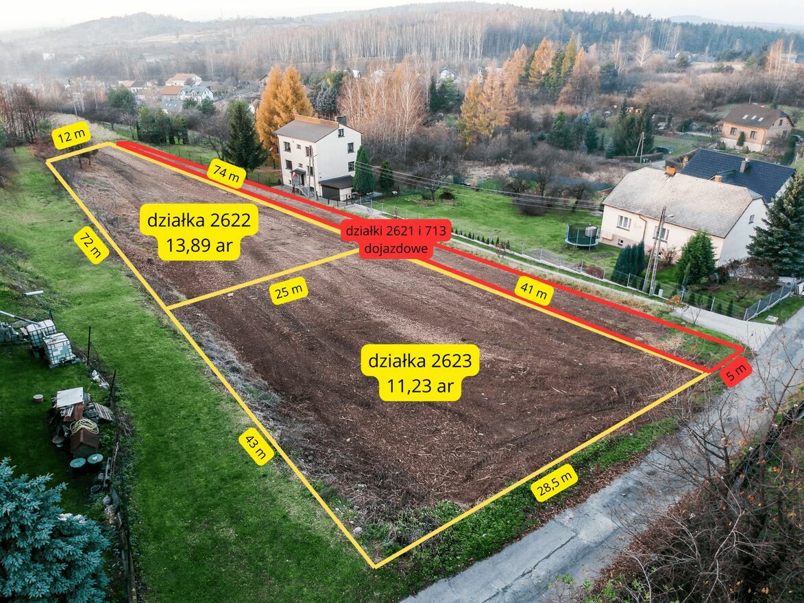 Przy zakupie działki, kupujący nabywa również część udziałów w działkach 2621 i 713 stanowiących dojazd do sprzedawanej nieruchomości.